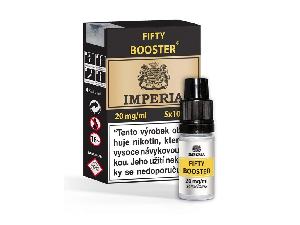 IMPERIA FIFTY BOOSTER 20 mg – 5×10 ml (PG50/VG50) Silná nikotinová báze určená pro výrobu vlastních e‑liquidů.